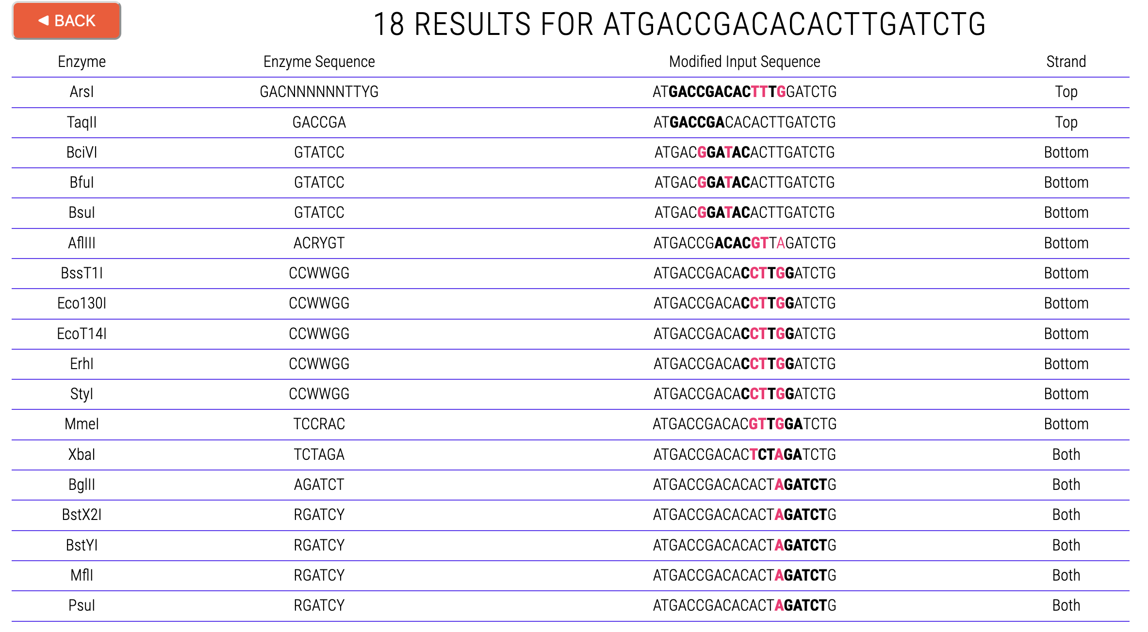 An example output for a 21 bp DNA sequence (5’–ATGACCGACACACTTGATCTG–3’) encoding a 7 aa peptide (MTDTLDL) is shown above. In this case, 6-cutters and up were chosen.